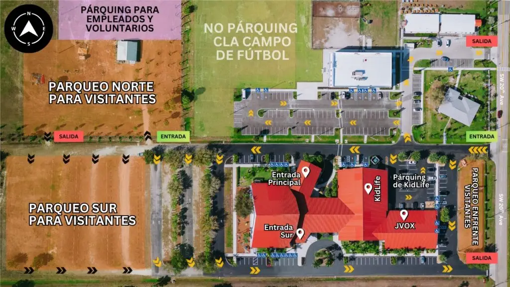 Disponemos de estacionamiento alrededor del edificio de la iglesia, frente al edificio de la escuela, alrededor de nuestras oficinas, en el aparcamiento de KidLife, frente a la iglesia y en dos aparcamientos adicionales, el norte y el sur, situados en la parte de atrás de la iglesia.